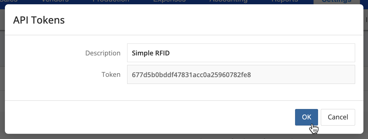 Give the token a description, like "Simple RFID". Make a note of the Token (you'll enter this in Simple RFID) then press OK.