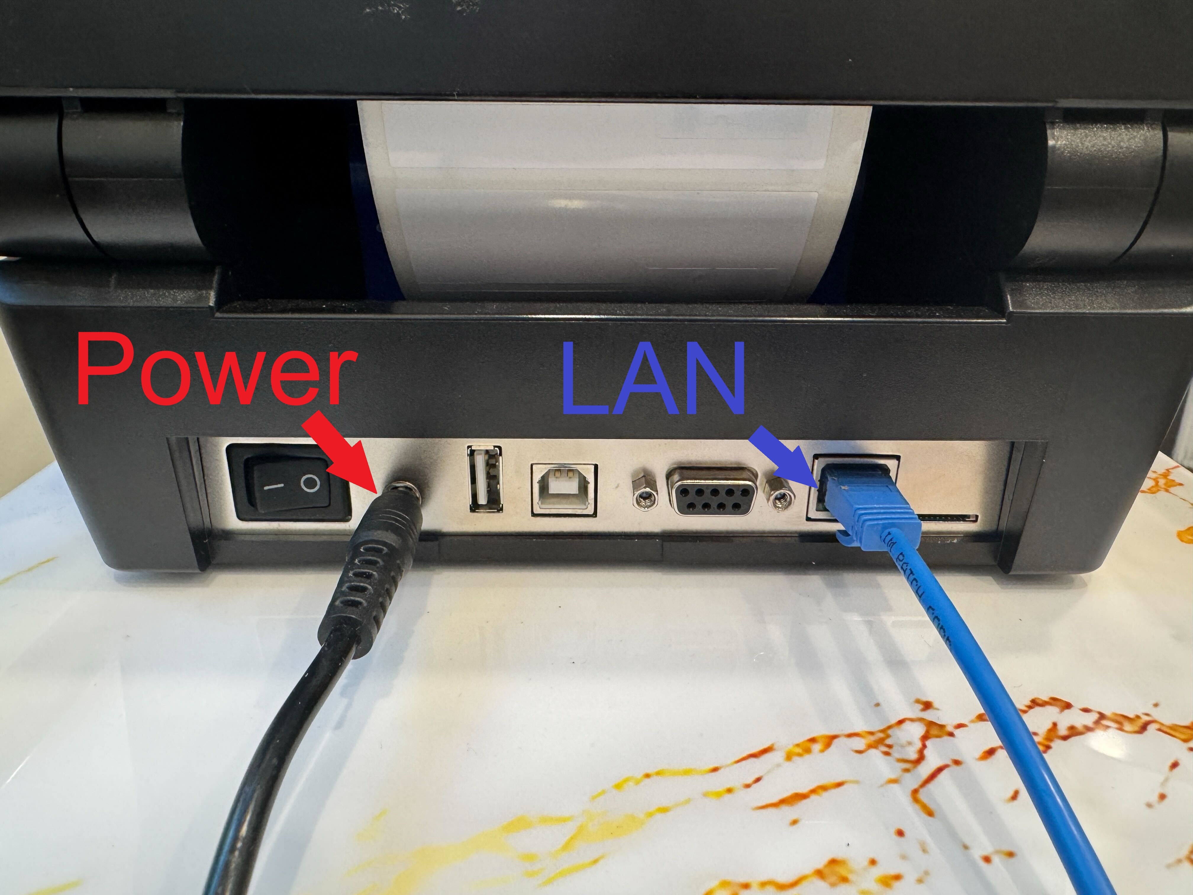 - The power cable plugs into the back of the printer.